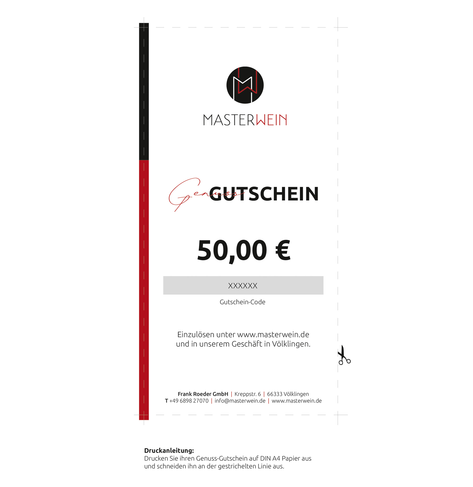 Sie erhalten von uns nach Kauf eines Gutscheines eine pdf-Datei zugemailt. Diese können Sie sich selbst ausdrucken und überreichen oder weiter mailen. Siehe nebenstehendes Bild (zum Vergrößern bitte anklicken!). Auf dem Gutschein finden Sie unter dem Betrag einen Code, mit dem der Beschenkte den Gutschein im MASTERWEIN Webshop einlösen kann!