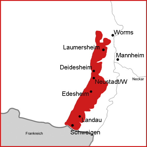 Das bis Ende 1992 Rheinpfalz genannte deutsche Anbaugebiet besitzt sowohl der Produktionsmenge als auch der Qualität seiner Weine nach große Bedeutung. Die Rebfläche von 23.700 Hektar erstreckt sich etwa 80 km am Ostrand des Pfälzer Waldes entlang. In manchen Orten der Südhälfte, im Bereich der Südlichen Weinstraße, bedecken Reben bis zu 96 % des verfügbaren Lands. Nur manche Teile von Tälern, wo Gefahr von Kaltlufteinbrüchen besteht, sind nicht mit Reben besetzt. In diesem Bereich hat der Weinbau in den letzten 25 Jahren eine beträchtliche Ausdehnung erfahren. Nördlich von Neustadt im Bereich Mittelhaardt/Deutsche Weinstraße befinden sich Weinlagen mit international bekannten Namen, berühmt gemacht durch Weingüter mit historischer Reputation wie Bassermann-Jordan, Bürklin-Wolf und von Buhl. Doch auch an anderen Stellen der Pfalz ist die Qualität der Weinerzeugung inzwischen so hoch, dass Ruppertsberg, Forst, Deidesheim, Wachenheim, Bad Dürkheim und Kallstadt kein Monopol mehr auf die besten Weine haben. Die Pfalz ist zu einem der interessantesten Gebiete geworden, die der Weinliebhaber heute besuchen kann.