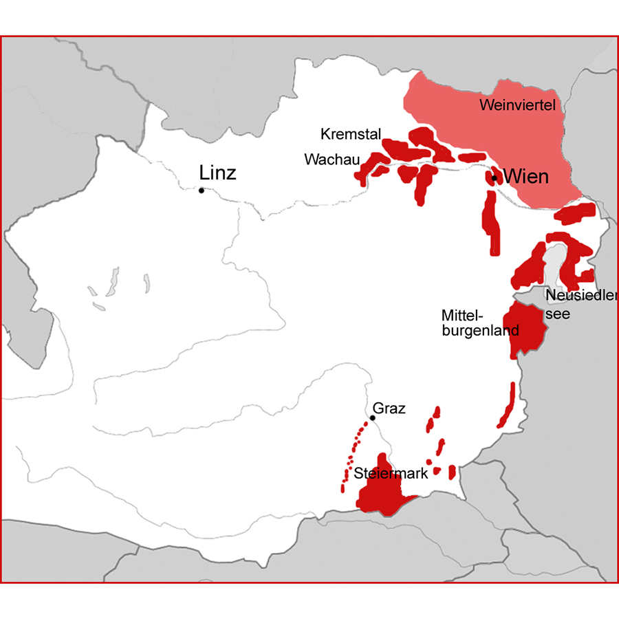 Ähnlich wie in Deutschland ist Österreich ein Weißweinland. Von seinen insgesamt 44.210 Hektar Rebfläche sind gut zwei Drittel mit weißen Reben bestockt. Der Grüne Veltliner dominiert mit rund 32%, hinzu kommen Welschriesling (6%) und Riesling (4%), es folgen Weißburgunder, Chardonnay und Sauvignon Blanc. Die bedeutendsten Rotweinsorten sind Blauer Zweigelt (13%) und Blaufränkisch (6%).