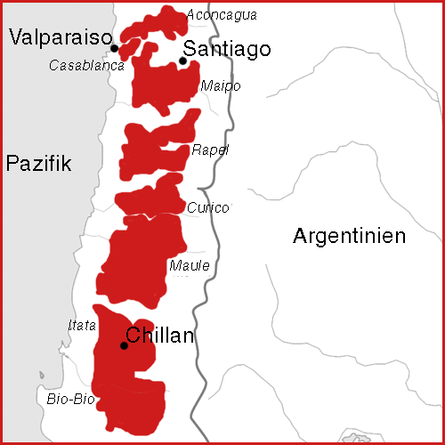 Chile ist ein Land der Gegensätze: An der breitesten Stelle nur 180 Kilometer breit, aber von Nord nach Süd mehr als 4.500 Kilometer lang (dies entspricht der Entfernung Madrid - Moskau). Entsprechend groß sind auch die klimatischen Unterschiede: Trockenes Wüstenklima im Norden bis zu arktischer Kälte im Süden. Weinbau ist daher nur in den mittleren Regionen etwa 200 km nördlich bis 700 km südlich der Hauptstadt Santiago möglich, zwischen dem 32. und 38. Breitengrad, dies entspricht Südspanien bzw. Nordafrika. Dennoch ist das Weinbauklima dort nicht so heiß wie in Südeuropa, da der kühle Pazifik für ein Klima ähnlich wie in Bordeaux bzw. Napa Valley sorgt. Man unterscheidet insgesamt 5 Weinbau-Zonen im Central Valley (Acongagua mit Casablanca, Maipo, Rapel, Maule und Bio-Bio), das von den Anden und den Küstenkordilleren begrenzt wird, mit ca. 118.000 Hektar (Stand 2007). Zuzüglich gibt es große Flächen zum Anbau von Tafeltrauben und Trauben zur Erzeugung des chilenischen Nationalgetränkes Pisco.