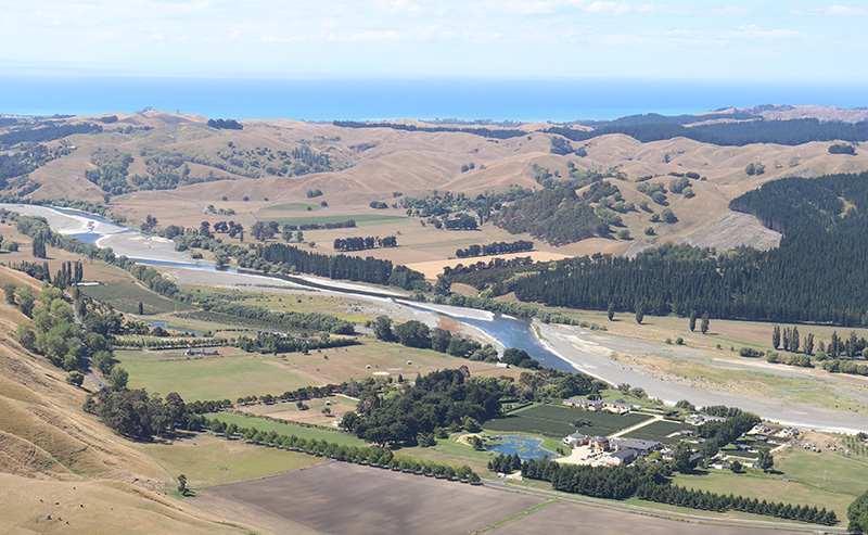 An zwei Standorten erzeugt Craggy Range Wein: In Hawkes Bay gedeihen eher die Bordeaux Rebsorten und besonders Syrah. Dort werden in der Giants Winery (auf den Bildern oben zu sehen) kraftvolle Rotweine erzeugt. Besonders die sehr steinige Lage Gimblett Gravels hat sich als exzellent für die Syrah-Traube geeignet bewiesen. Dort, wo vor Jahrtausenden ein Gletscher die Felsen zermalmte und Richtung Pazifik schob, wirkt die Szenerie wie in einem ausgetrockneten Flussbett. Die Syrah-Weine, die hier entstehen, haben eher die pfeffrige Aromatik und Feinheit eines Syrah von der nördlichen Rhône als die Wucht und Kraft eines australischen Shiraz.