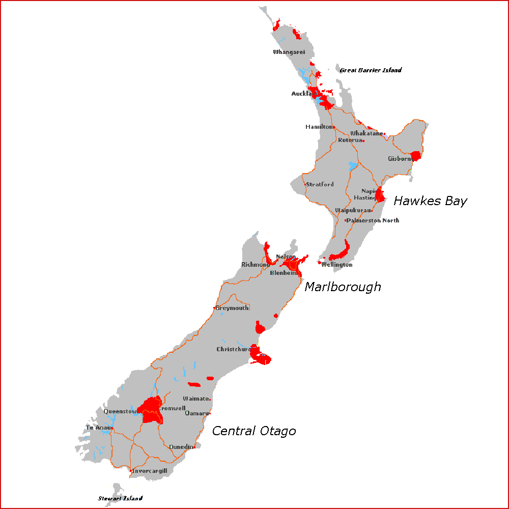 Die neun Weinbaugebiete verteilen sich über 1.200 km von der Nordinsel bei Auckland (Weltklasse Chardonnay), Gisborn, Hawkes Bay (berühmt für Syrah) und Wairarapa mit Martinborough (Pinot Noir) über die Südinsel mit Marlborough (Sauvignon Blanc), Nelson, Canterbury bei Christchurch bis zum südlichsten Weinbaugebiet der Erde, Central Otago (berühmt für Pinot Noir).