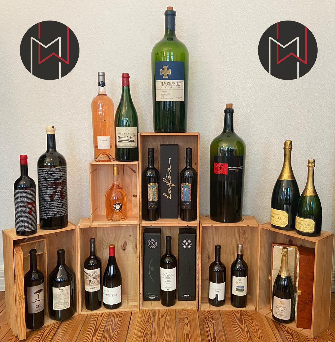 Deshalb führen wir zahlreiche der beliebtesten Weine in unserem Sortiment auch in Magnum oder noch größeren Formaten. Dazu zählen z.B. die Magnumflaschen der Lafoà-Weine Chardonnay und Sauvignon Blanc der Kellerei Schreckbichl, ebenso wie die Rosés von Ferry-Lacombe, Naos und Cascai in Magnum und Cascai gar in der Doppelmagnum. Den Lugana Montunal gibt es genauso in der Magnum wie sein großer Bruder Orestilla. Die Spanier Pino Doncel Black, Pino Doncel 12 Meses, Rioja La Montesa, Pi Tinto 3.1415..., Flor de Primavera und Mas Collet vertreten. Beim Champagner sind Magnum von Petitjean und Bruno Paillard wieder auf Lager. Selbst ikonische, langlebige Rieslinge aus Versteigerungen wie Berncasteler Doctor von Thanisch oder Ayler Kupp von Peter Lauer gehören dazu. Im Foto sehen Sie ausschließlich Flaschen im Magnum-Format bis hin zu 12 Liter Bouteillen. Normalflaschen sind dort nicht abgebildet.