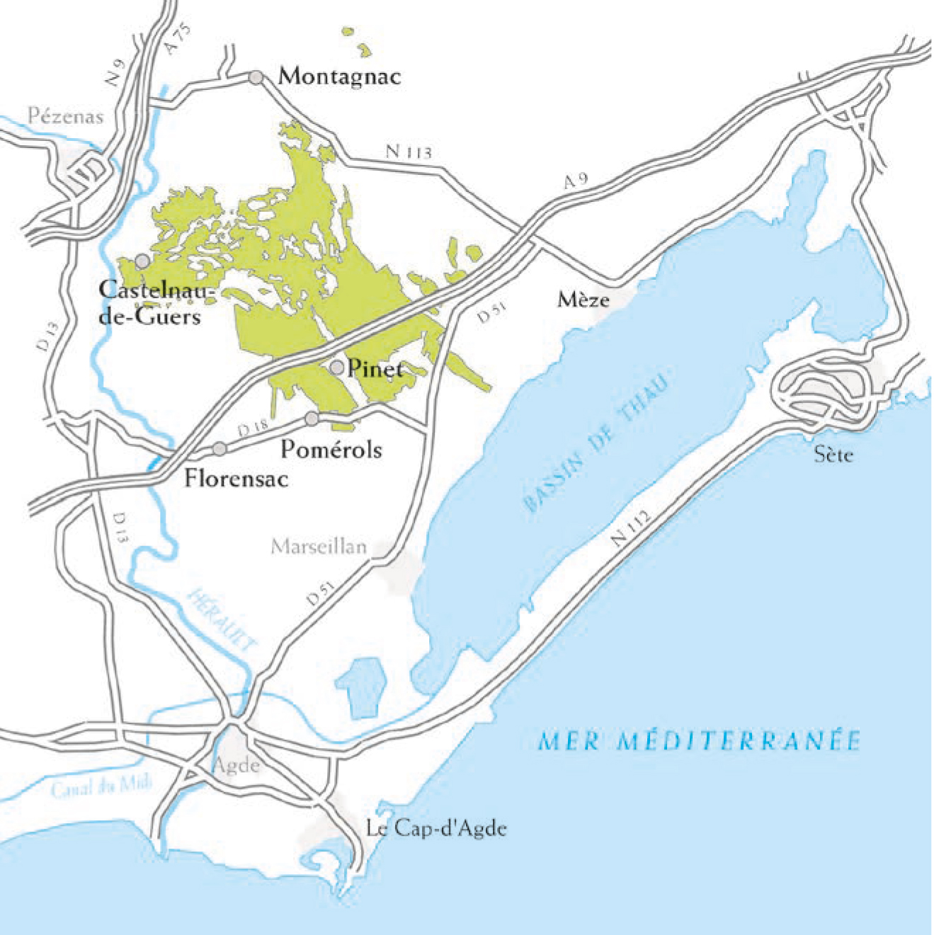 Kultiviert werden rund 1.400 Hektar Reben: Was in französischen Dimensionen zunächst überschaubar klingt, ist tatsächlich die größte Weißwein-Appellation im Languedoc! Die Region ist zweigeteilt: Im Norden ist das Terroir um Montagnac ein mit Quarzkieseln beladenes Ton-Kalk-Plateau. Dort wechseln sich Rebflächen mit Pinienwäldern und Garriques ab, während im Süden eine homogene Fläche steiniger Gletscherböden mit Reben bis zum Meer bestockt ist.